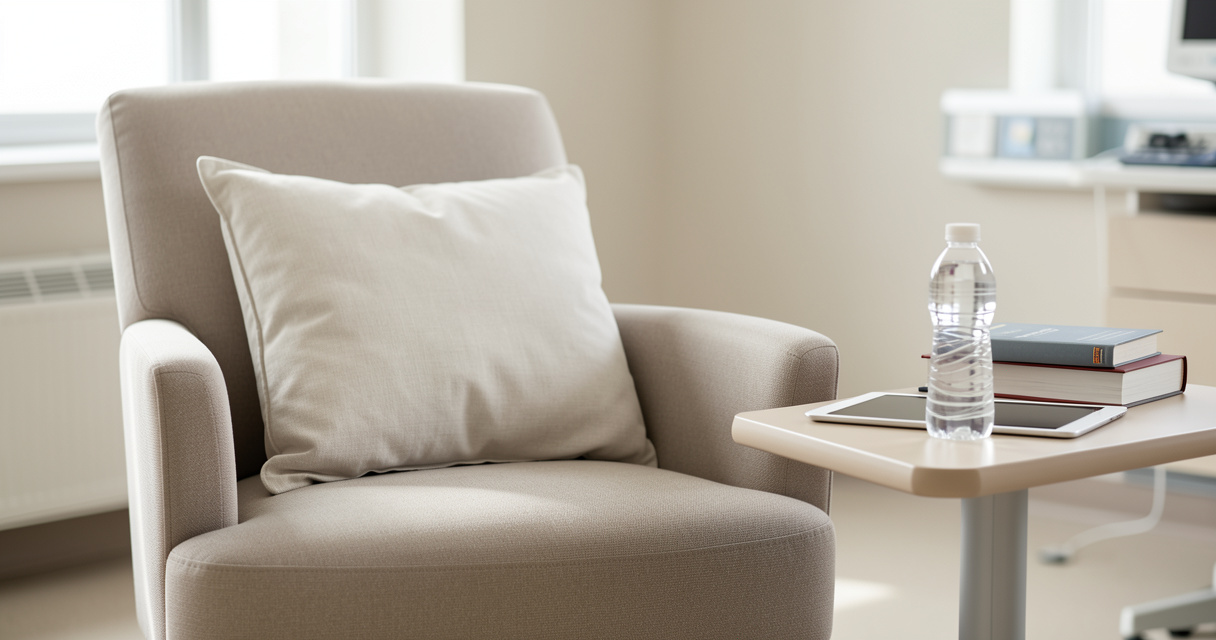 - Alimentation : Une bouteille d’eau et une collation légère (compote, biscuits secs). Évitez les aliments aux odeurs marquées qui pourraient vous écœurer durant la perfusion.